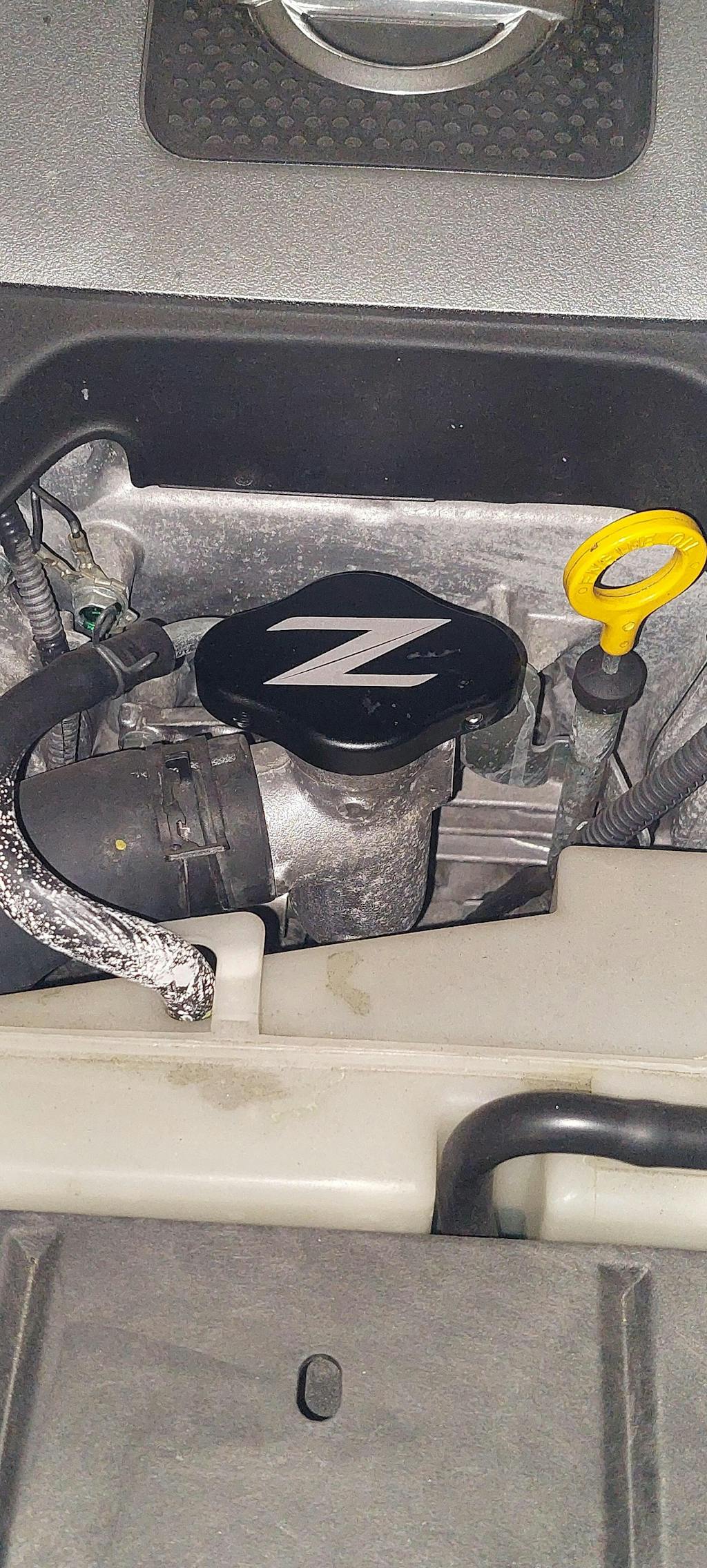 Billet-aluminum engraved radiator cap cover fitting the 370z Z34. The cap cover attaches to the radiator cap via allen set screws (allen key included).